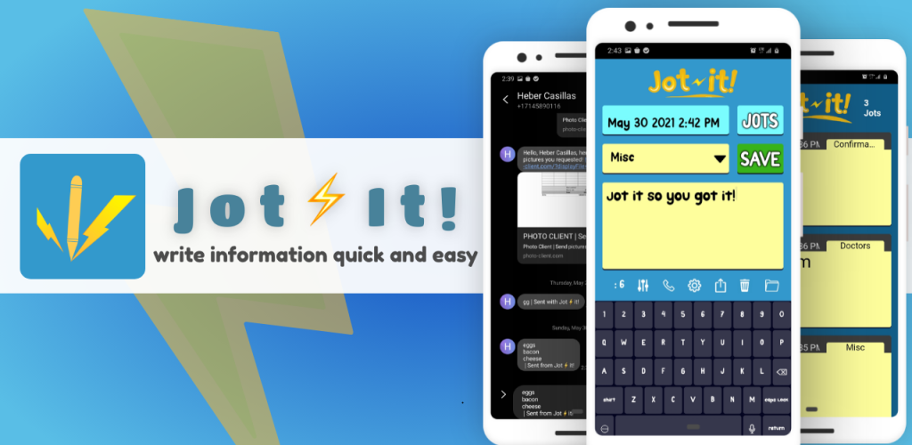 Jot notes with ease with Jot It! It takes seconds to Jot down what you need. Gone are the days of multiple notes at your desk. The best way to take notes is at the touch of your fingertips.
