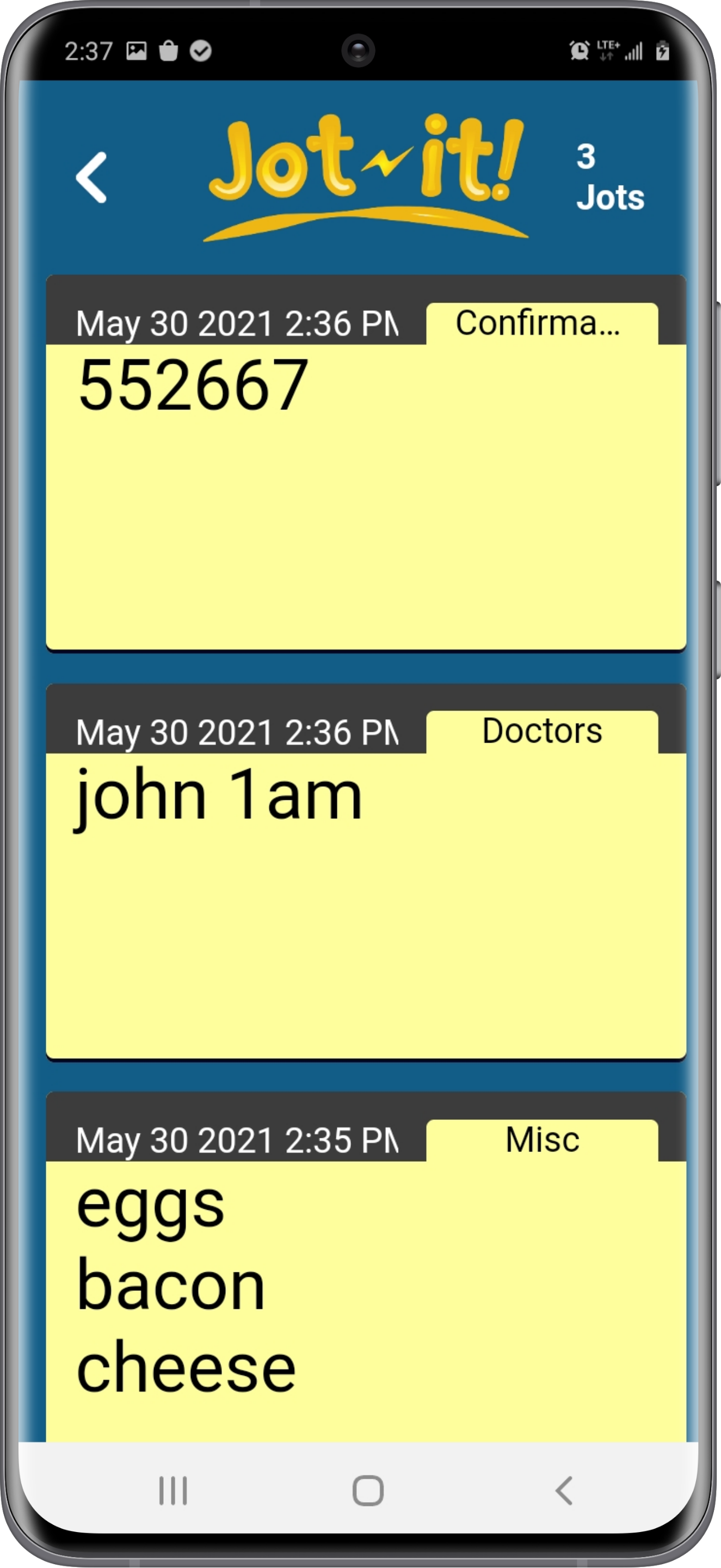 Jot down doctor's appointments, confirmation codes, recipies, ideas, and other things that you would normaly write. Then have them whenever you need. Don't lose a thought, save it with a Jot!